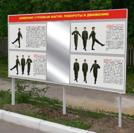 Движение строевым шагом. Повороты в движении В-СТР-03 2950×1550 мм Стенд с зеркалом на металлическом каркасе со стойками (УФ-ламинация, алюминиевый профиль, антивандальное зеркало, чехол). Размер зеркала 600х1350 мм
