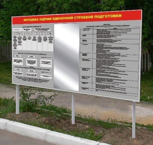Методика оценки одиночной строевой подготовки В-СТР-07 2950×1550 мм Стенд с зеркалом на металлическом каркасе со стойками (УФ-ламинация, алюминиевый профиль, антивандальное зеркало, чехол). Размер зеркала 600х1350 мм